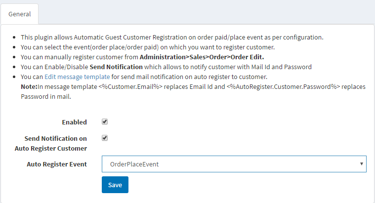 Auto Guest Register Plugin provides feature for register guest customer automatically. This plug-in also provide the feature to notify the guest customer with the appropriate Email and Password. You can also select particular event (Order Paid Event or Order Place Event) from plug-in configure page for automatically register guest customer.
